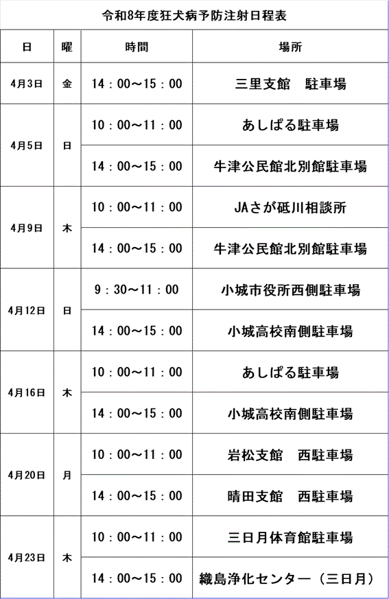 小城市では毎年4月に狂犬病予防のための集合注射を各地区で実施しています。今年も下記日程で行いますので、犬を飼われている方は、ご都合の良い会場で受けてください。また、市が実施する集合注射のほか、動物病院でも受けることができます。接種後は、狂犬病予防注射済の届出が必要ですので、市に手続をお願いします。