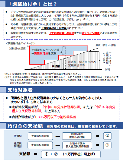 定額減税対象者のうち、定額減税可能額が税額を上回り減税しきれないと見込まれる方に対し、その差額を定額減税調整給付金として支給します。