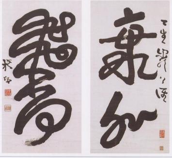 この二つの作品はともに中林梧竹が80代前半の頃の作品です。「海外飛香」は独特の工夫になる書体の文字で筆勢が躍動していて、堂々たるものです。「天山閣」は梧竹の作品の中でもスケールが大きく特筆すべき作品です。