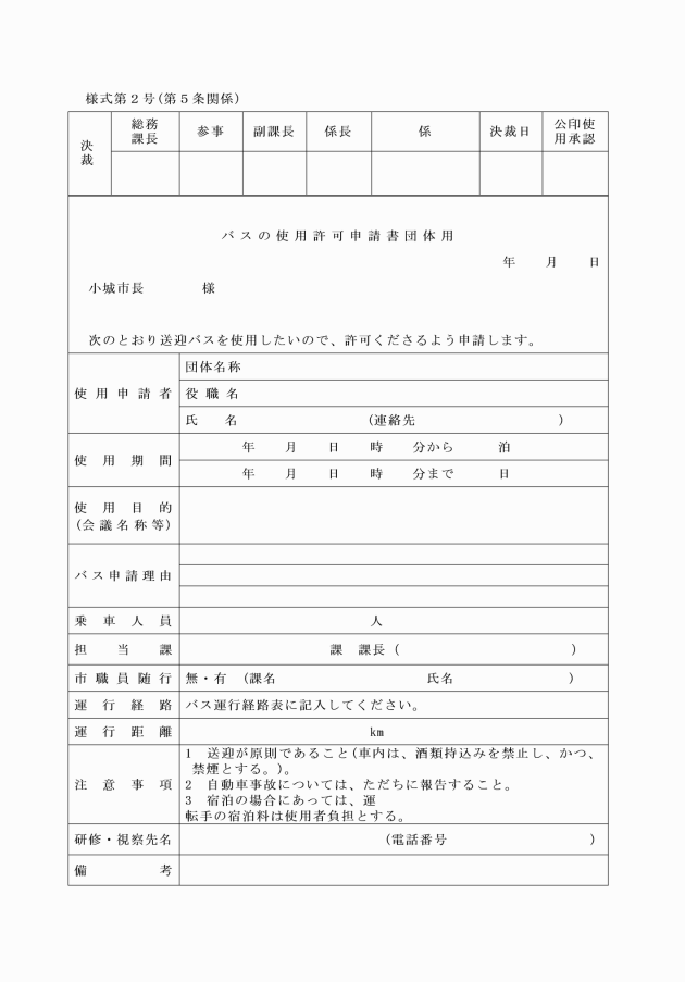 第3条 バスは、公用又は公共用の目的のため使用する場合であって、原則として乗車人員が15人以上、かつ、次の各号のいずれかに該当するときに限り使用することができる。ただし、市長が特に必要と認めるときは、その限りでない。