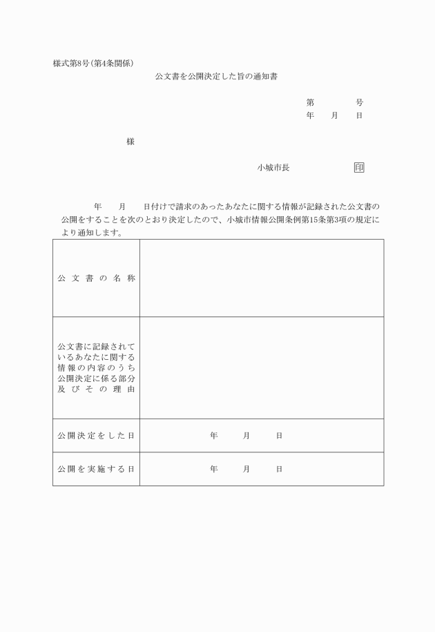3 条例第15条第3項後段の規定による通知は、公文書を公開決定した旨の通知書(様式第8号)によるものとする。