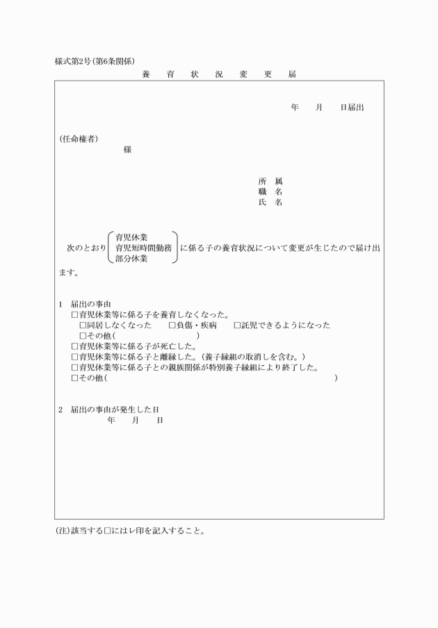 第6条 育児休業をしている職員は、次に掲げる場合には、遅滞なく、その旨を任命権者に届け出なければならない。