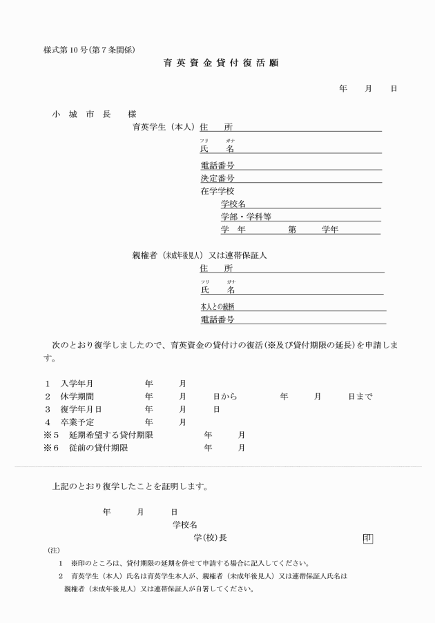 3 育英資金の返還猶予を受けようとする者は、育英資金返還猶予願(様式第14号)に、その事由を証明することのできる書類を添付して提出しなければならない。