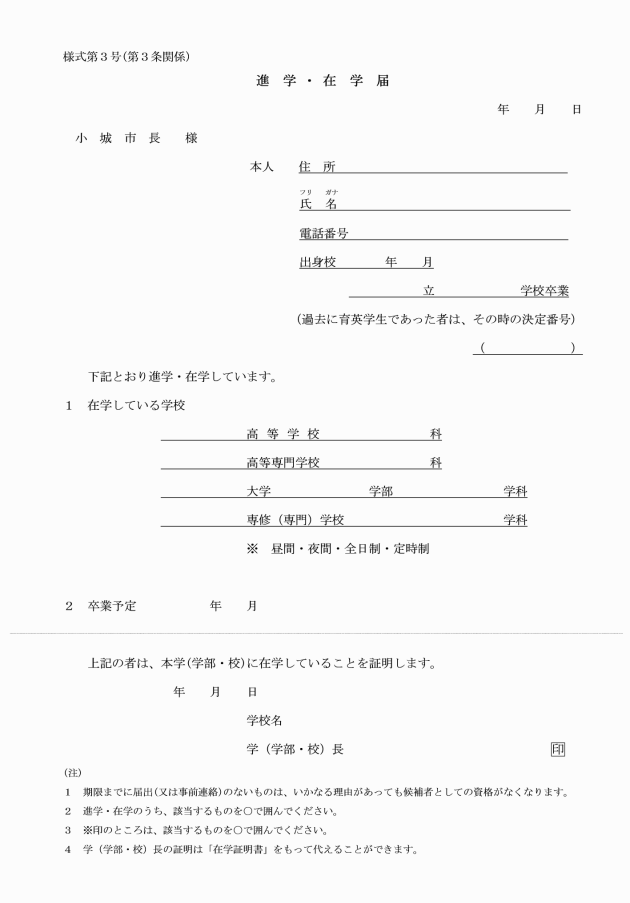 第5条 育英学生は、毎学年の在学証明書を4月末日までに、毎学年の成績証明書を翌年度の5月末日までに市長へ提出しなければならない。この場合において、期限までに提出がない場合は、育英学生を取り消すことができる。