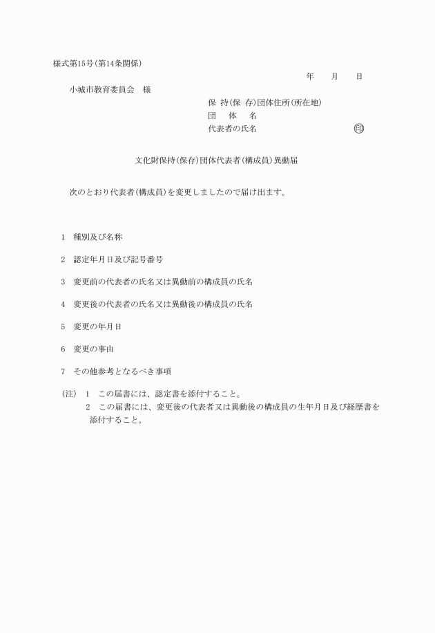 (4) 文化財保持(保存)団体代表者(構成員)異動届(様式第15号)