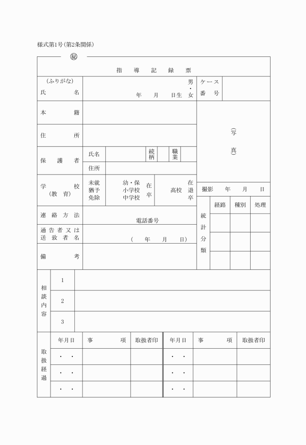 第3条 福祉事務所長は、知的障害者の福祉に関して調査するため必要があると認めるときは、出頭依頼書(様式第8号)により、当該知的障害者又はその保護者に出頭を求めることができる。