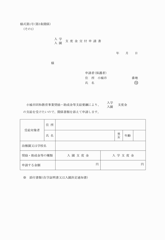 入園支度金 | 就園時の支度費 | 学校教育法(昭和22年法律第26号)第80条及び小城市立幼稚園の管理及び運営に関する規則(平成17年小城市教育委員会規則第15号)によって入園した者 | 新入園者20,000円 | 新入園1回に限る。 |