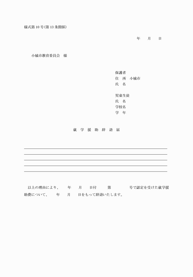 第13条 認定者は、就学援助費の支給を辞退するときは、教育委員会に対し、就学援助辞退届(様式第10号)を提出しなければならない。