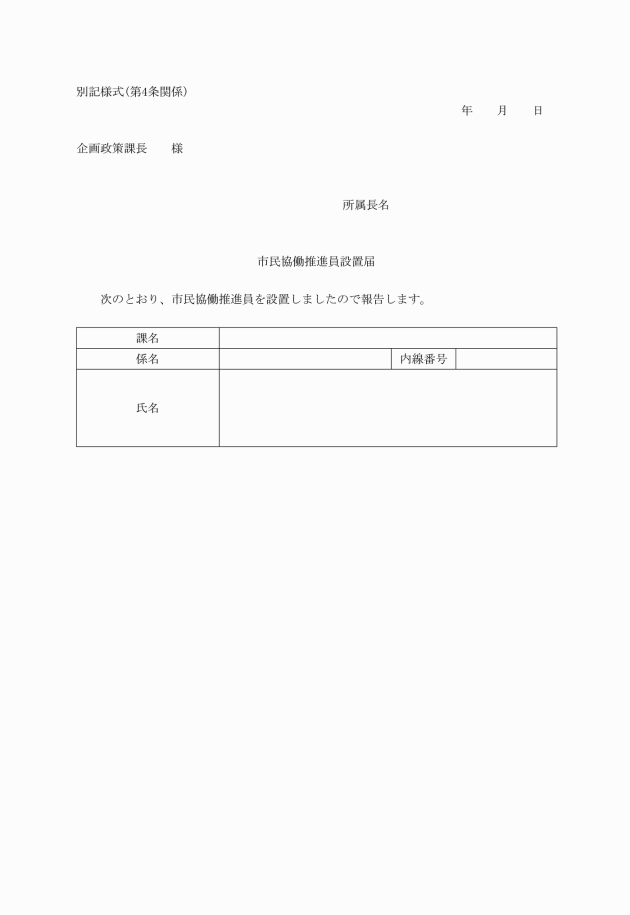 2 所属長は、推進員を指名し、市民協働推進員設置届(別記様式)により企画政策課長へ報告する。