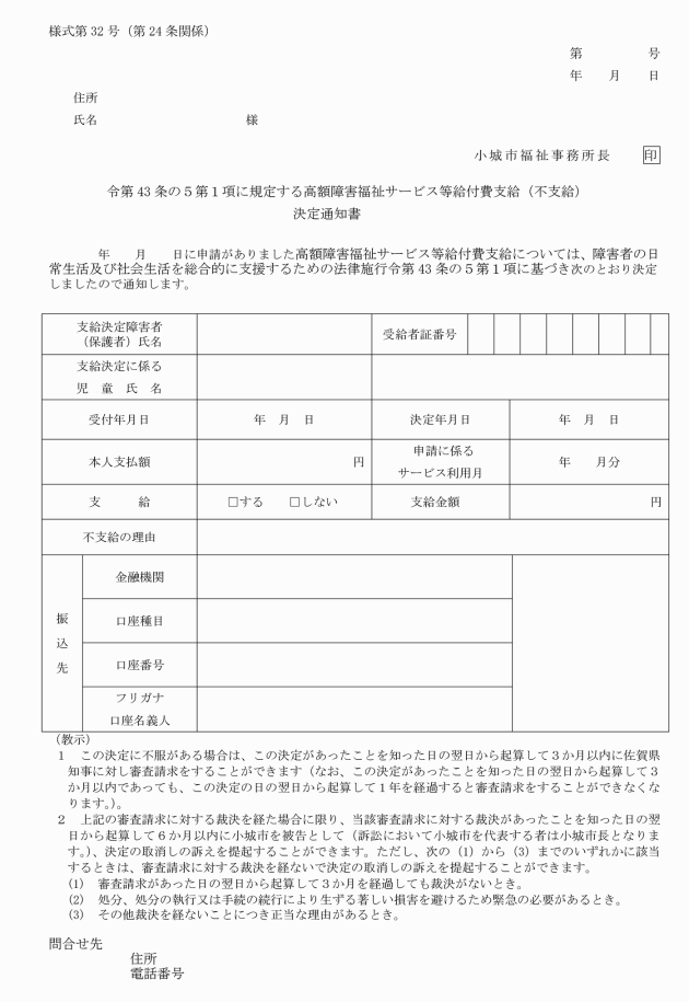 2 福祉事務所長は、法第76条第1項の規定により補装具費を支給しない旨を決定したときは、当該決定を受けた障害者又は障害児の保護者に対し、却下決定通知書(様式第29号)により通知するものとする。