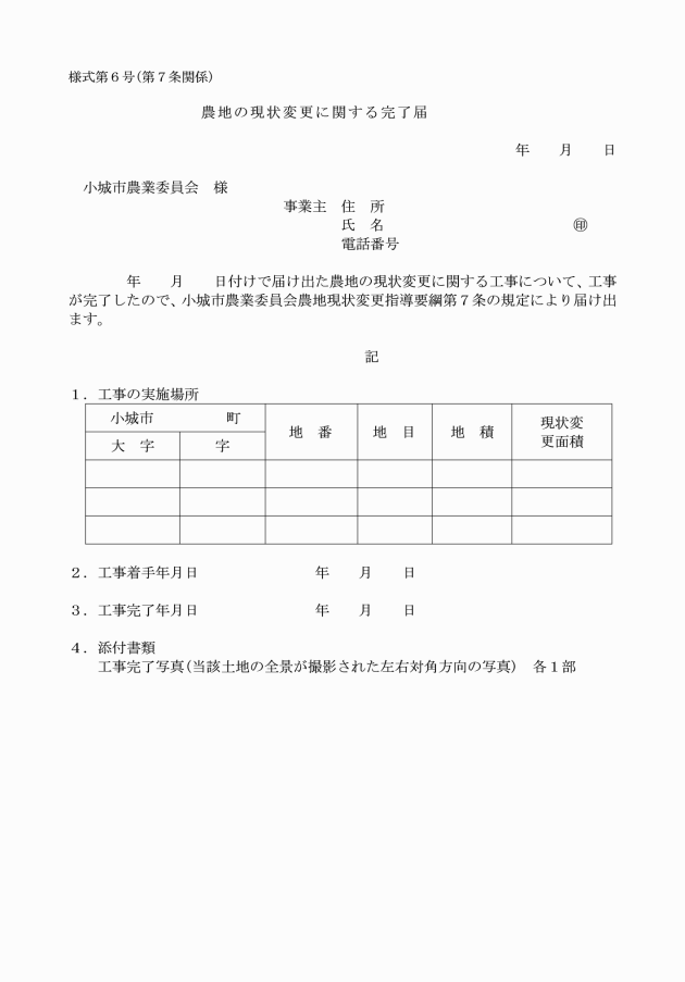 第7条 事業主は、当該工事が完了したときは、遅滞なく農地の現状変更に関する工事完了届(様式第6号)を農業委員会に提出するものとする。