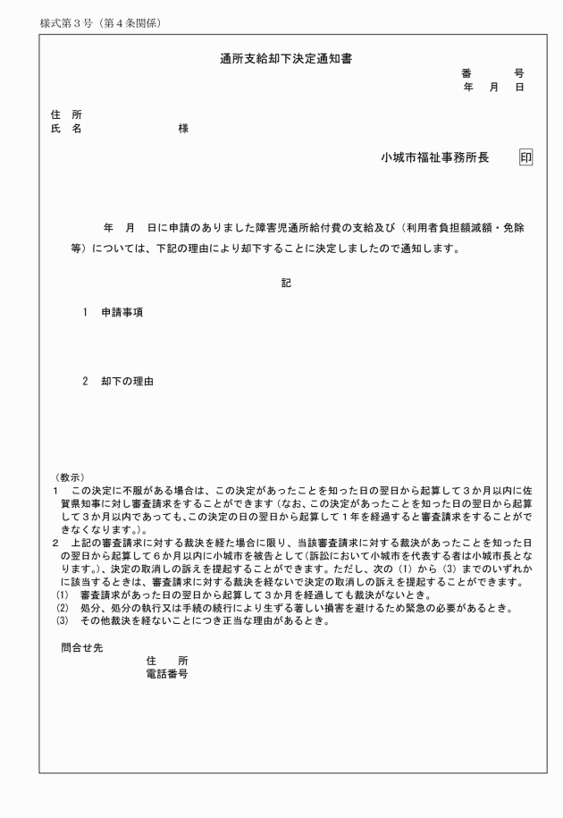第3条 法第21条の5の6第1項の規定による通所給付費決定の申請は、障害児通所給付費支給申請書兼利用者負担額減額・免除等申請書(様式第1号)とする。
