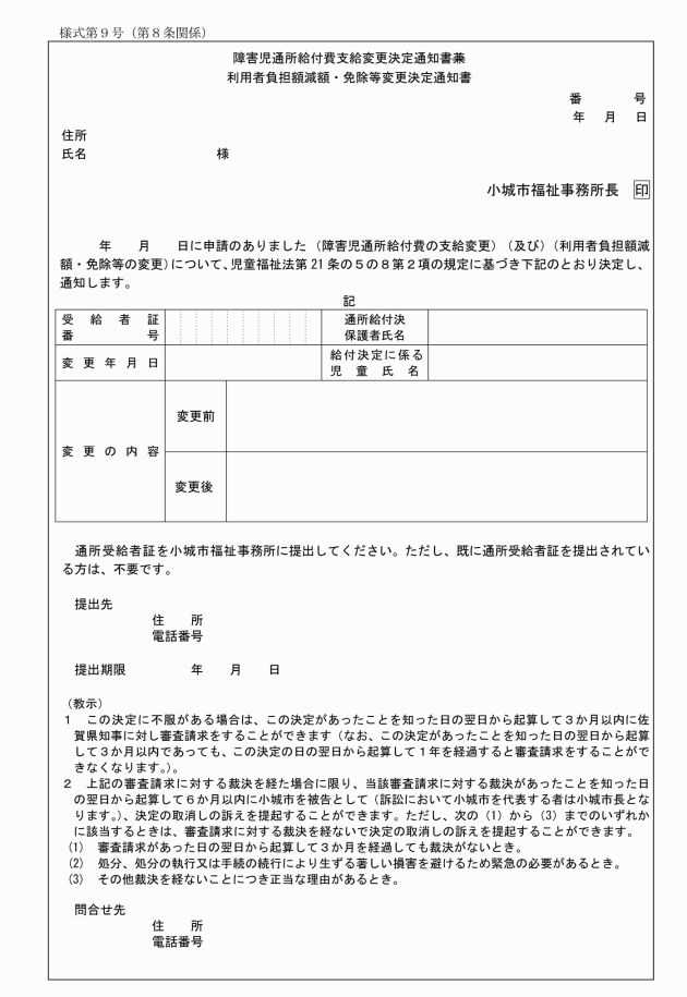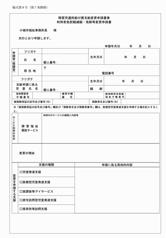 第7条 法第21条の5の8第1項の規定による通所給付決定の変更の申請は、障害児通所給付費支給変更申請書兼利用者負担額減額・免除等変更申請書(様式第8号)によるものとする。