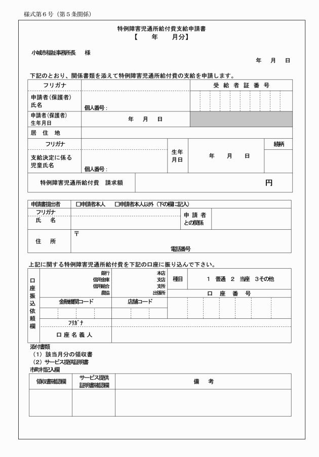 第5条 省令第18条の5に規定する申請は、特例障害児通所給付費支給申請書(様式第6号)とする。