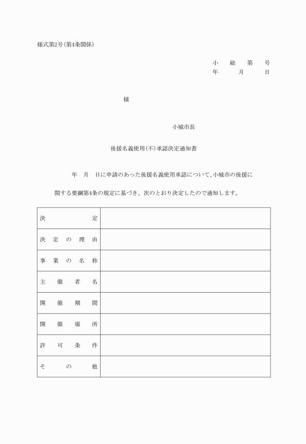 第3条 後援名義の使用の承認を受けようとする団体等(以下「申請者」という。)は、後援名義使用承認申請書(様式第1号)に参考となる資料を添付して、事業を開催しようとする20日前までに、市長に提出しなければならない。