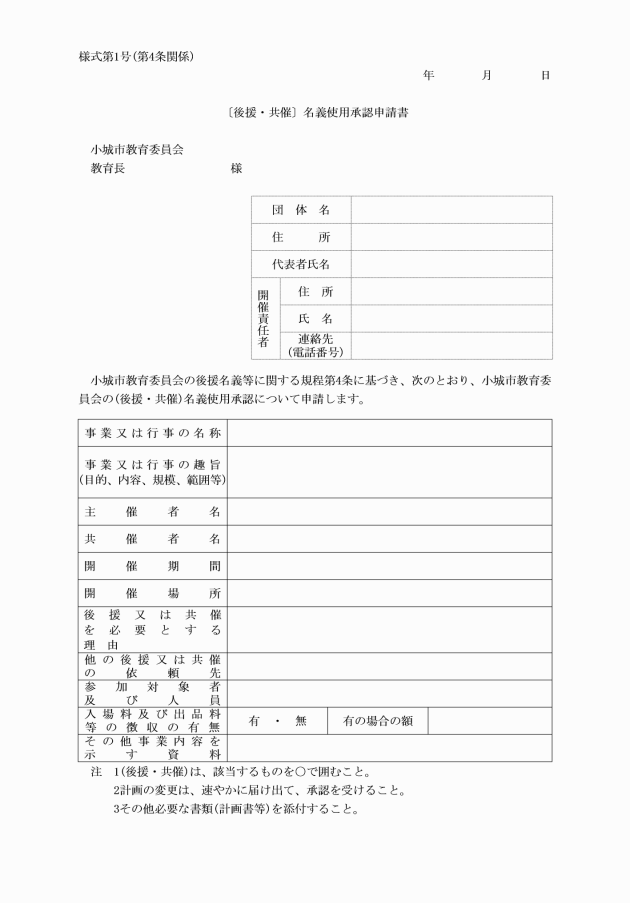 第4条 後援又は共催の名義使用の承認を受けようとする団体等(以下「申請者」という。)は、〔後援・共催〕名義使用承認申請書(様式第1号)に参考となる資料を添付して、教育委員会に提出しなければならない。