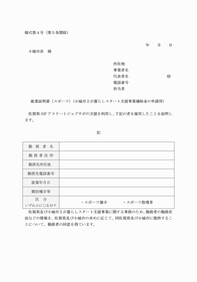 スポーツ振興に関する要件に該当する場合 | ・就業証明書(スポーツ)(様式第4号) |