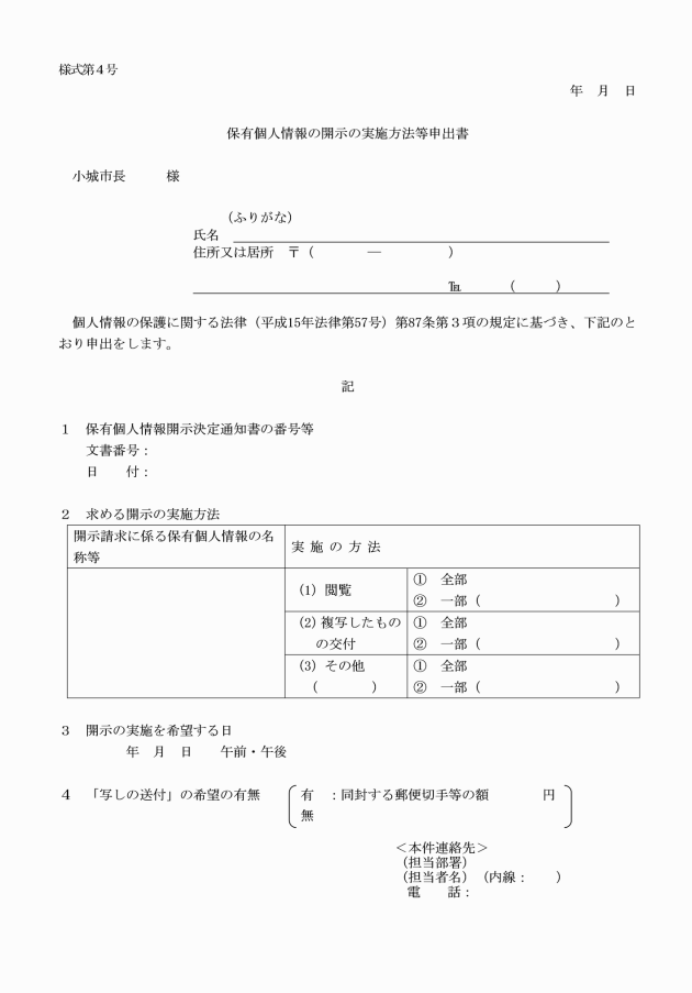 第2条 個人情報の開示、訂正、利用停止その他に関する文書の様式は、別表第1に掲げるところによるものとする。