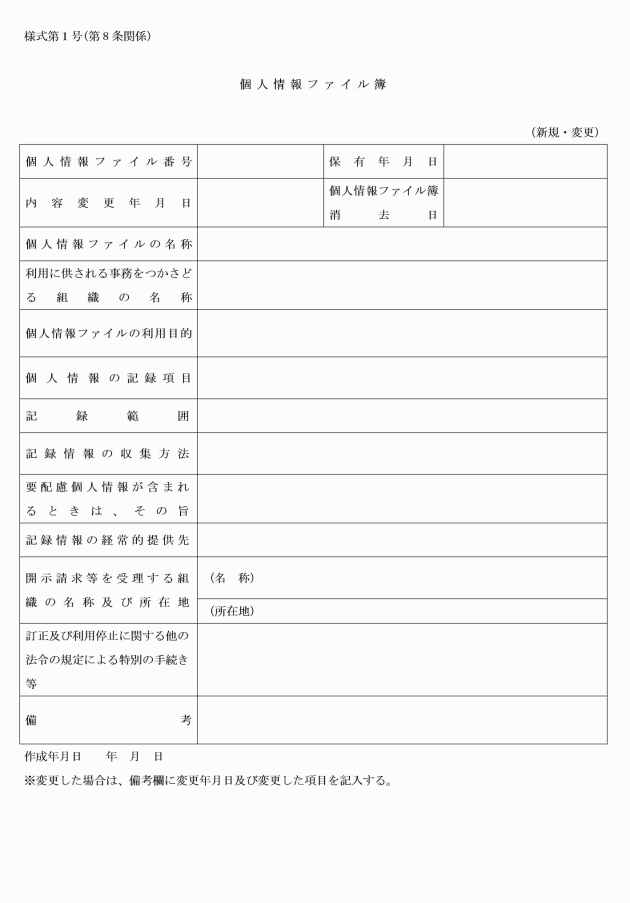 第8条 議長は、個人情報ファイル(条例第17条第2項各号に掲げるもの及び同条第3項の規定により個人情報ファイル簿に掲載しないものを除く。次項及び第4項において同じ。)を保有するに至ったときは、直ちに、個人情報ファイル簿(様式第1号)を作成しなければならない。